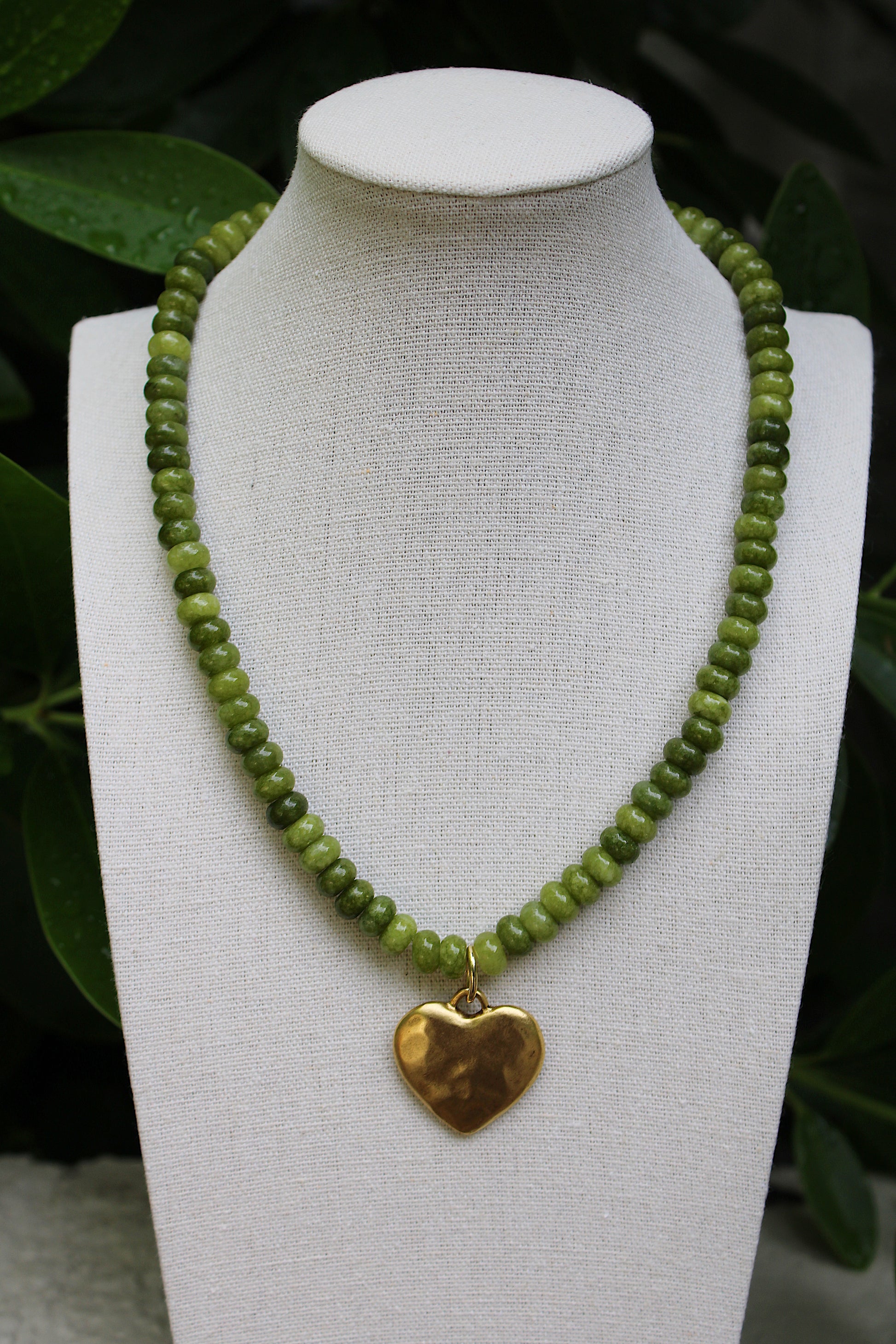 Jade stone with gold hammered heart pendant. 16-18” with 18k gold filled extender and clasp.