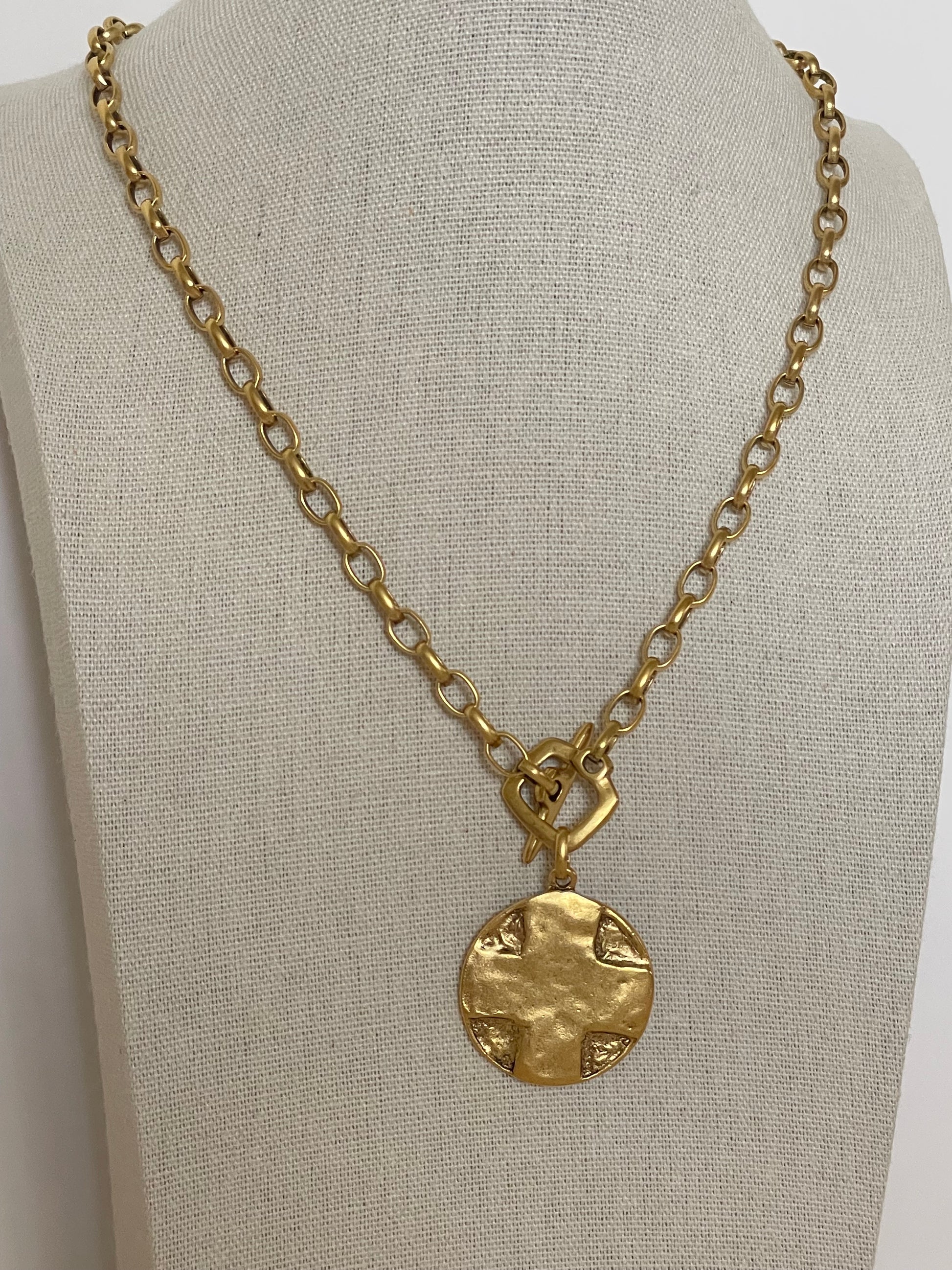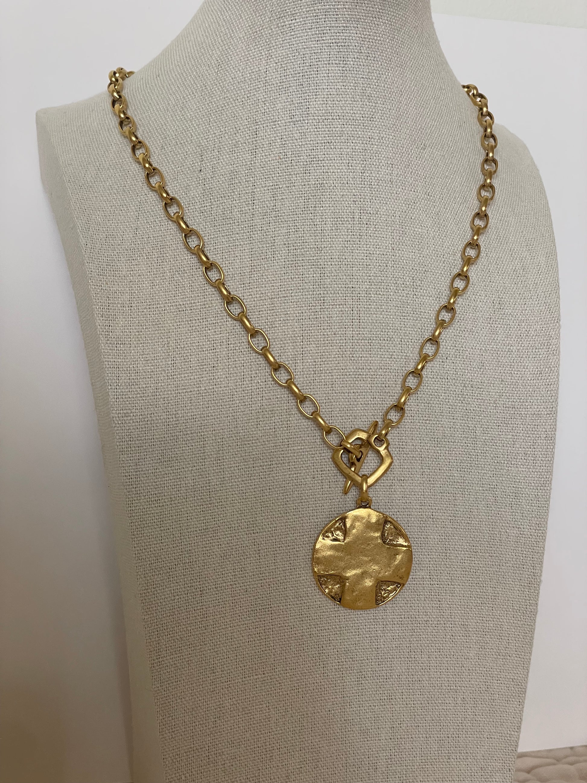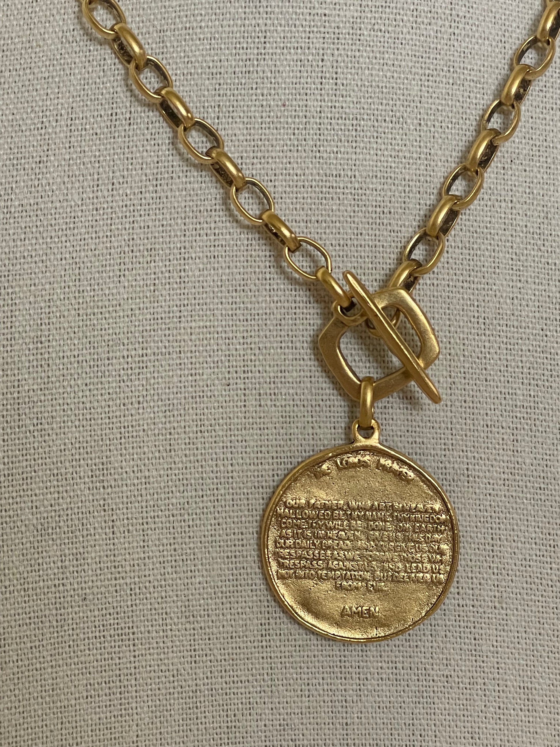 Antiqued gold plated Lord’s Prayer necklace on an 18” 12k gold plated link chain with a hammered square toggle. Lord’s prayer engraved on the back.