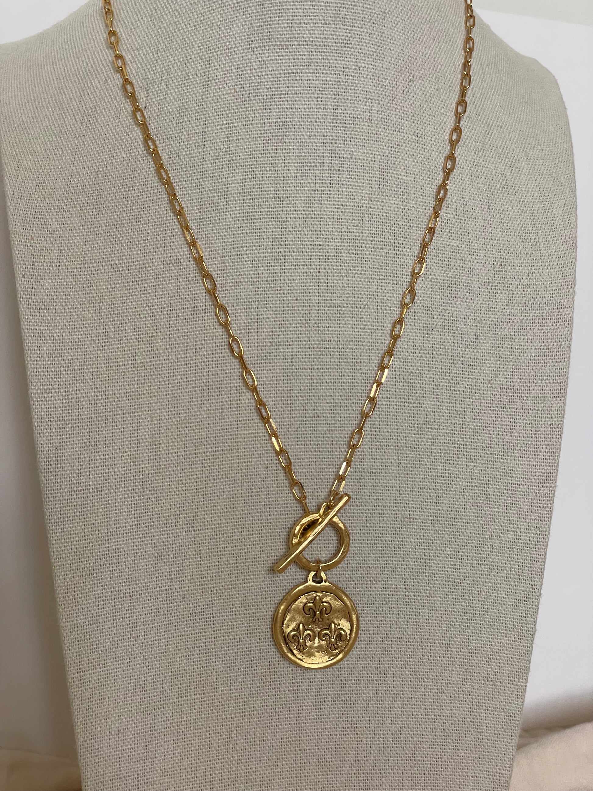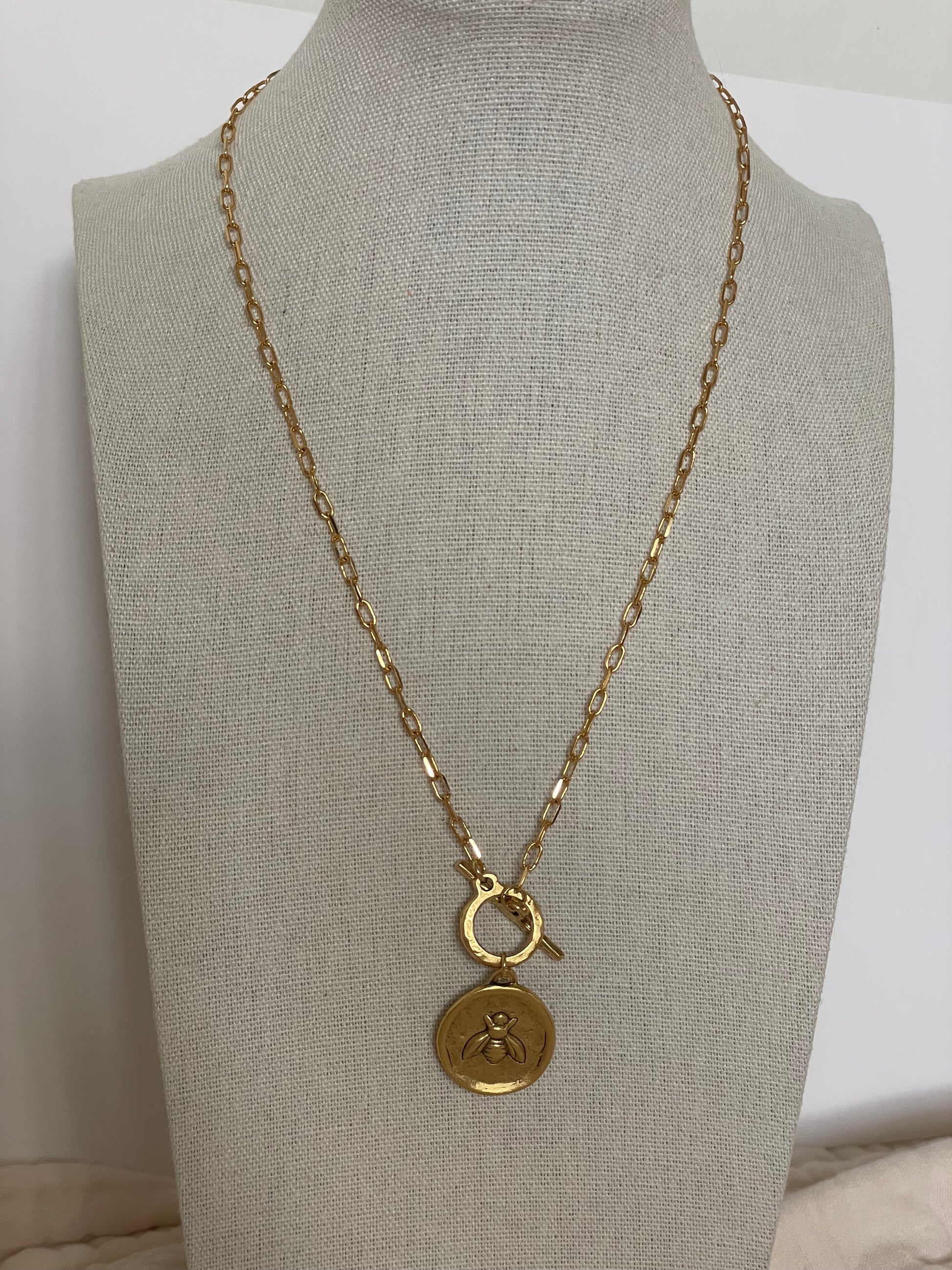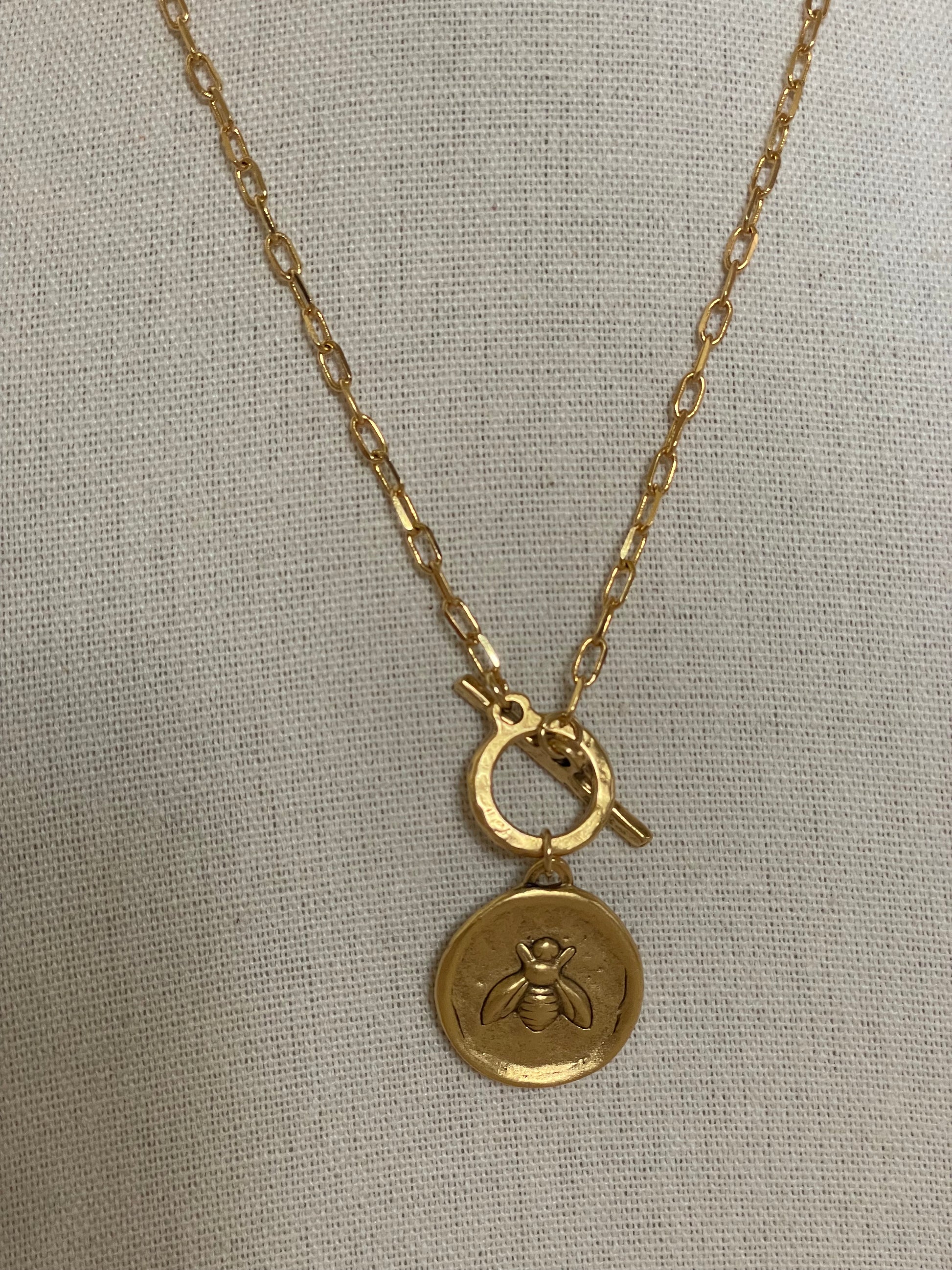 12k Antiqued gold plated Mini Bee necklace on an 16” 12k antiqued gold link chain with hammered round toggle. Reversible front and back design.