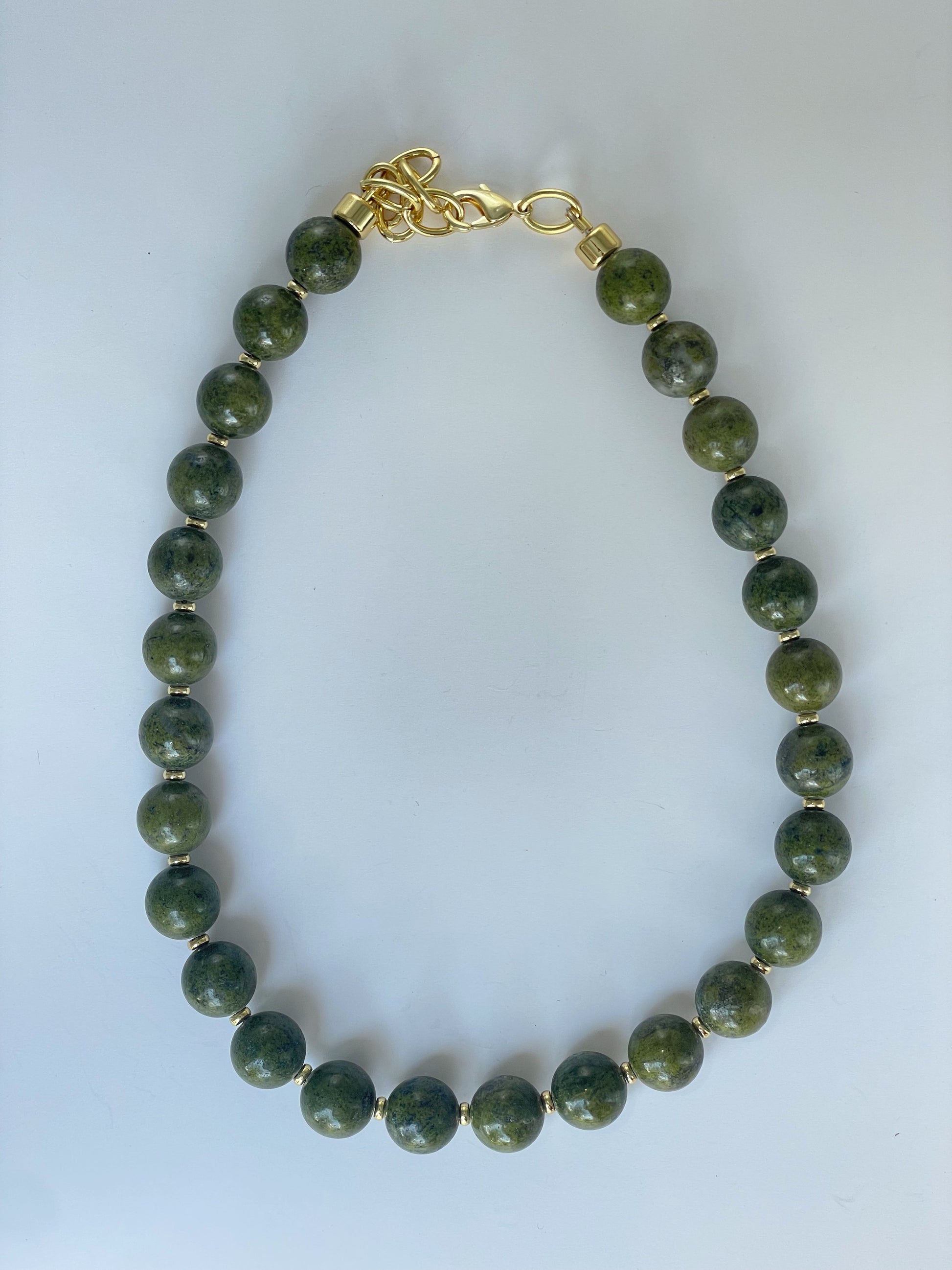 15.5” Natural Green Chalcopyrite stone beads with 18k gold spacer beads.
