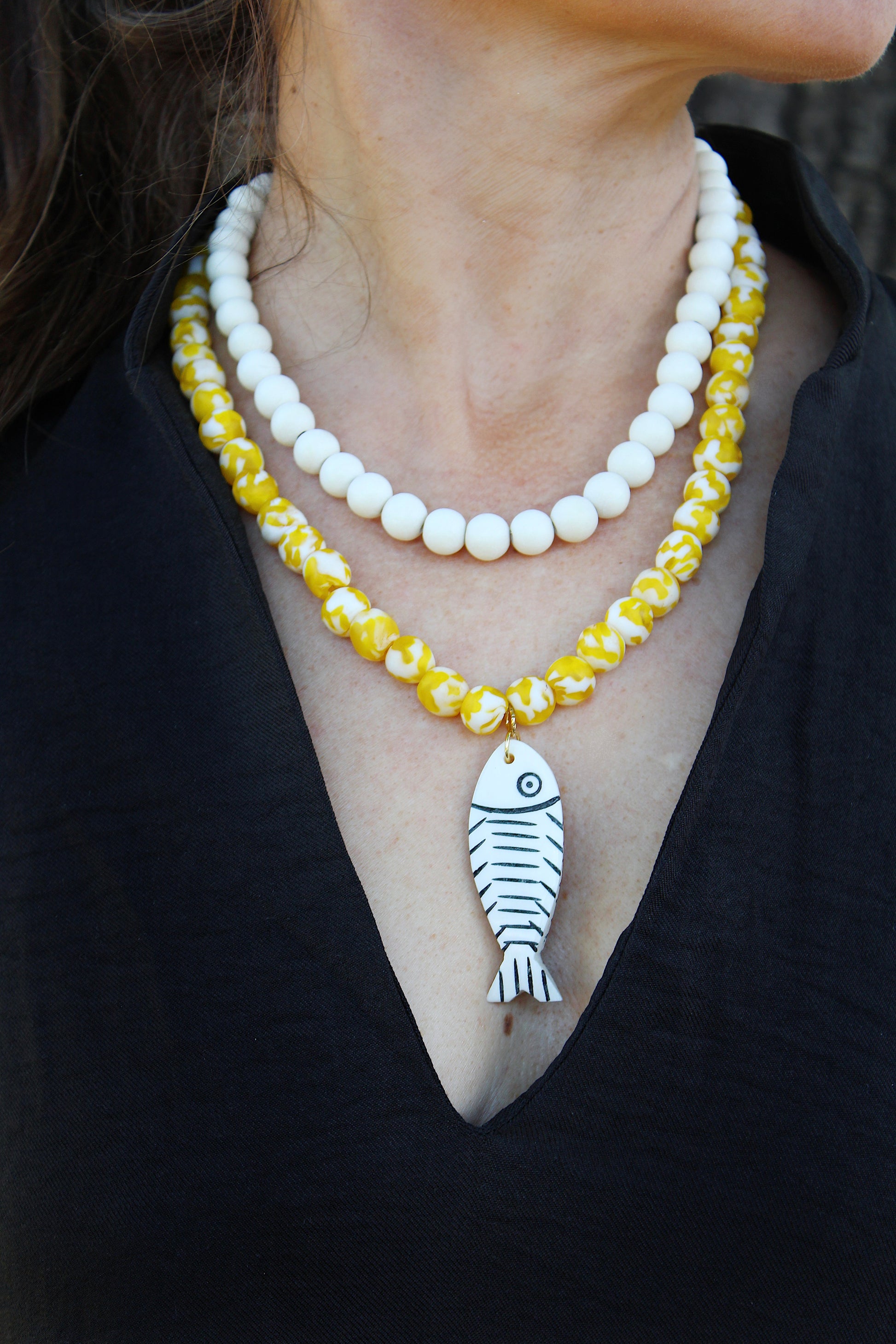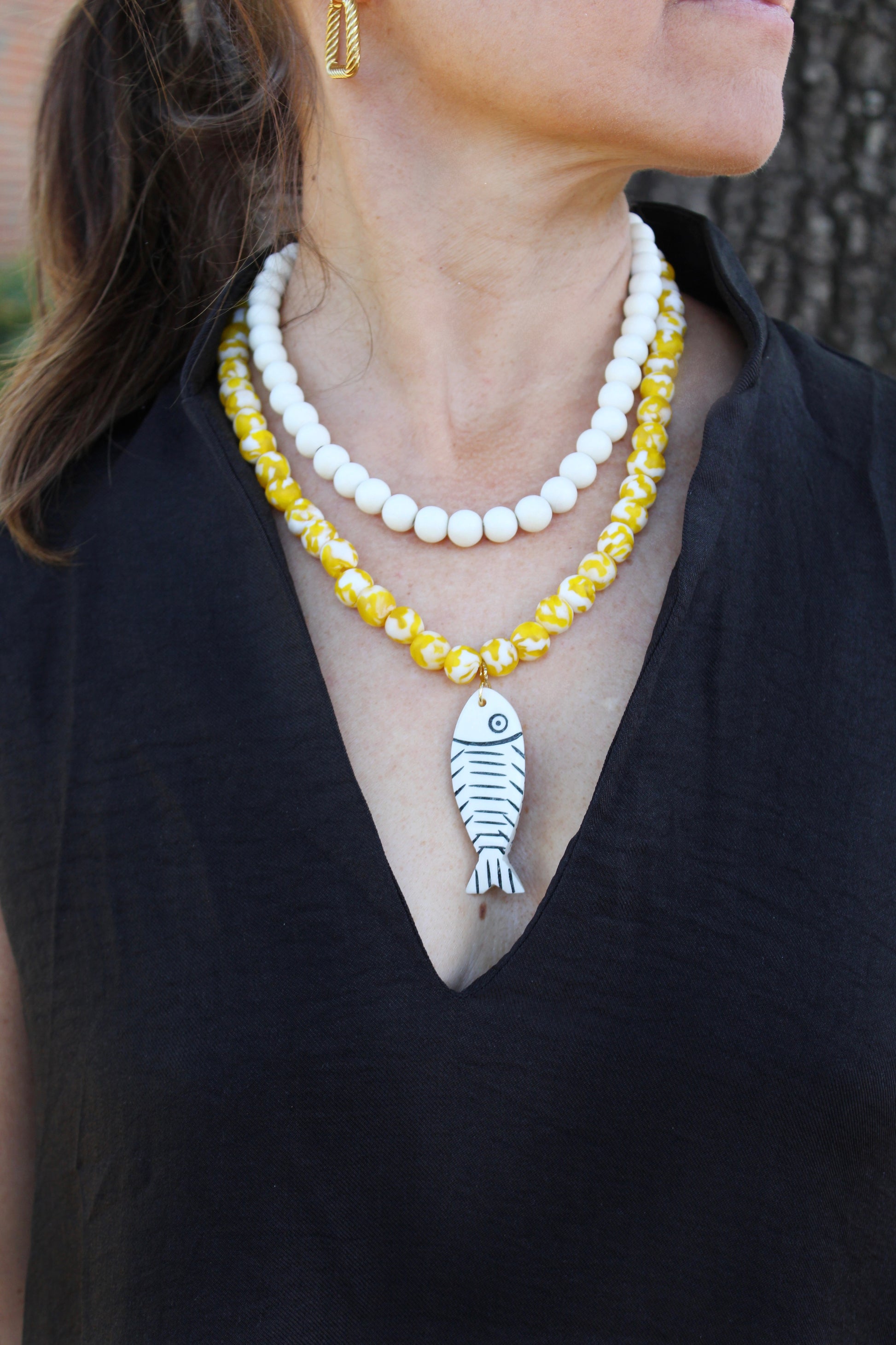 Double stack necklace with large bone fish pendant carved in Kenya on a white and yellow beaded double necklace. Chunky 18k gold filled chain extender with 18k gold filled clasp.